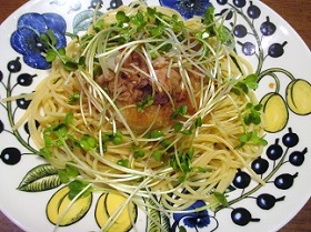 4 パスタを皿に盛り、予め油をさっと切ったツナ、たっぷりの大根おろし、好みのトッピングを加