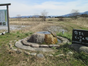 胎内市地本地区の水芭蕉は、高山植物でありながら海岸から2km、標高8mの広大な湿地帯に群生しているという珍しいもの。ここは、胎内川扇状地の扇端に位置するため湧水が豊富で、それが水芭蕉の生育を可能にしているとの。歩いていてところどころで見かけた“どっこん水”の水源でもある。