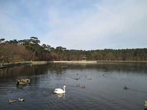 国道をしばらく歩くと、やがて右手にお幕場大池が見えてくる。お幕場森林公園は、岩船から塩谷にいたる国道345号と日本海に挟まれた地域で、大池のあたりから赤松の林が延々と3kmほど続く。かつてはお幕場といわれ、村上藩の殿様や奥方らの行楽の場として使われていたという。