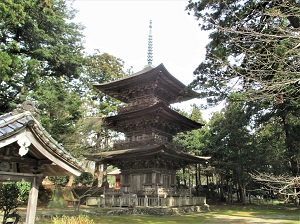 仁王門を入り、本堂に向かって右手前に立つ三重塔は、元和6年(1620)、村上城主周防守忠勝の寄進により建立されたもので、国の重要文化財としての風格を示している。