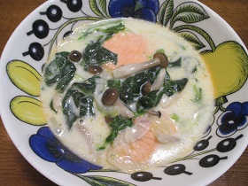 5 人参に火が通ったら、牛乳、ほうれん草、2の鮭を加え、沸騰させないように気を付けながら煮込む。