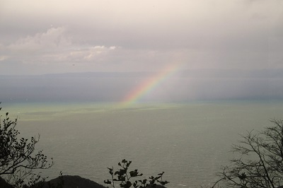この時、佐渡の浮かぶ日本海にたまたま大きな虹が架かった。スケールの大きな自然のなせる技にしばし見とれる。