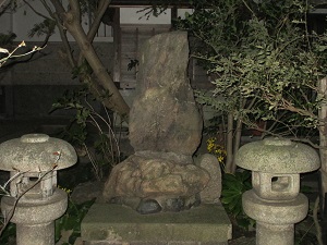 夜明け前の暗闇の中で目を凝らしてみると、本堂右側の植え込みの中に「芭蕉翁蓑塚」と刻まれた石碑があった。