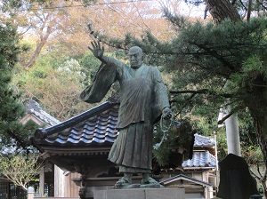 群生する石蕗(つわぶき)の中、坂を降りていくと、法福寺の飛地境内に祖師堂があり、道路を挟んだ向かいに日蓮聖人獅子吼説法像がある。しかし、老朽化のせいか地震のせいか危険なためロープが張られていて敷地内には入れなくなっている。