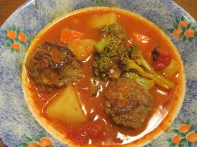 4 煮込み用の鍋に、<トマトソース>の材料を加えて加熱し、3で焼き色が付いたミートボールと好みの野菜を加えて、中弱火で煮込む。