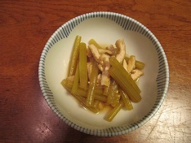 1 ふきは塩で板ずりをし、皮むきの手間を考慮して、なるべく長いまま茹でる。