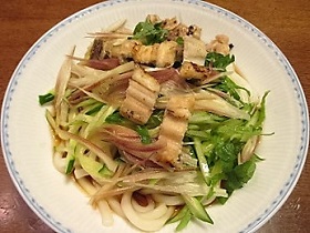 5 器にうどんを盛り、アナゴと薬味をのせ、つゆをかけて完成。