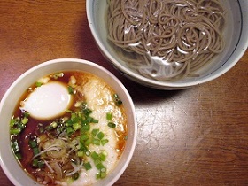 湯にはった器に入れた蕎麦を、つけ麺のようにして食べる。