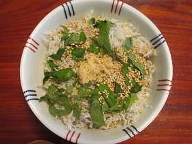 湘南の定番料理。簡単でヘルシーでさっぱりした美味しさ! ■材料 釜揚げしらす 50gくらい 大葉 5~6枚くらい 生姜 大さじ1 白炒りゴマ 大さじ1 醤油またはだし醤油 大さじ2程度 ご飯 1膳半くらい ■作り方 1 生姜をすりおろし、大葉を刻んでおく。 2 どんぶりに温かいご飯をよそったら、釜揚げしらすを乗せ、大葉と炒りゴマをちらし、中心にす りおろした生姜を乗せておく。 3 お好みで醤油かだし醤油を回しかけたら出来上がり。