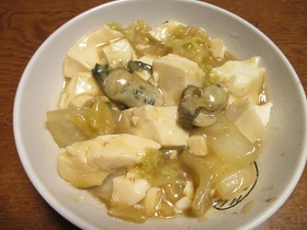 6 食べやすい大きさに切った豆腐を5に加え、豆腐が温まったら牡蠣を加える。
