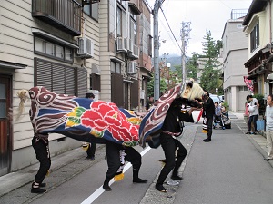 そこから急な階段を下りて温泉街に行くと、何やら賑やかな声が聞こえて来た。折しも、山中温泉最大のイベント「こいこい祭」の開催中で、大変な賑わいであった。細い路地に露天商が多数並び、結構、地元の若者や観光客の若者が大勢参加していて、おおいに盛り上がっていた。たまたま通りがかりで見た獅子舞も、なかなかなものだった。