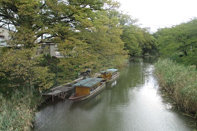 江沼神社から大聖寺川に沿った道を上流方向に少し行くと、大聖寺川下りの乗船場があり、この街を一層風情あるものにしている。