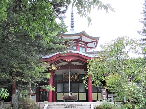 行基開創による寺で、朱塗りの多宝塔を持ち、山中温泉を守護する寺として薬師如来を祀っている。芭蕉と曾良も到着した次の日に早速お参りしている。