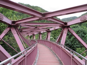 あやとり橋は独特のS字型をした橋で、その真下は鶴仙渓のなかでも最も深く蒼々とした道明が淵といわれる景勝地である。