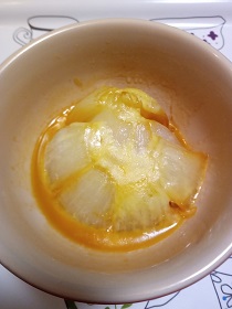 ・1で浅い器にラップをかけると玉ねぎが押しつぶされてしまうので、深めの器に固めの蓋をのせるとよい。