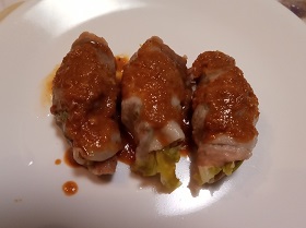 たっぷりのキャベツの千切りを薄切り豚ロースで巻いたものを蒸して、ゴマダレをかけていただく。