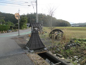 国道脇に国指定史跡小谷城跡と小谷城戦国歴史資料館の案内標識が出ているので、標識にしたがって進むと、常夜灯や小さな水車が見えてくる。そこには、城下町大谷市場跡の石碑と北国脇往還郡上宿跡という板書も立てられていた。この市場は浅井三代小谷城時代に武家屋敷から巷間の台所までまかなっていたという。