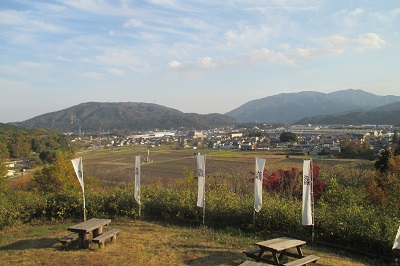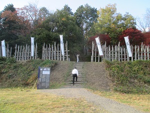 閑静な玉宿の集落を通り、国道に合流して少し行くと、街道脇に「笹尾山石田三成陣地一丁」の標識が立ち、さらに少し行くと「決戦地石田三成陣跡」の案内表示板があった。それにしたがって少し行くと関ケ原古戦場が目の前に広がり、左手の小高いところに石田三成の旗印が見える。ここが石田三成の陣地・笹尾山で、芭蕉の旅とは関係ないが、今回の旅で必ず立ち寄りたいと思っていたところである。8年前に中山道歩き旅の途中で関ケ原古戦場跡も訪れたときは、石田三成陣地跡はちょっと離れている徳川家康最後陣地跡のあたりから眺めただけだったので、ずっと心残りであった。