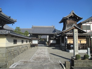 養老鉄道踏切を越えた少し先に正覚寺がある。通りに面して焔魔堂と愛宕神社が並んでいてちょっと分かりにくいが、正覚寺入口に「芭蕉・木因遺跡」という石碑と「当境有芭蕉翁碑」、および説明板が立っている。正覚寺はこの標柱の奥にある小さなお寺で、境内には「芭蕉塚」と多くの句碑が建っている。