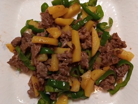 1 少し幅広の細切りにした牛肉を料理酒、醤油、塩コショウ、片栗粉と共にボウルに入れて揉みこみ、ラップをかけて冷蔵庫で15分程なじませる。