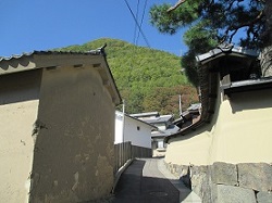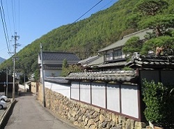 上塩尻地区に入ると、街道右側から迫る虚空蔵山に沿うように狭くて曲がりくねった坂道が続く。そういうところに、塀をめぐらしている大きな家が立ち並んでいて、独特の雰囲気がある。