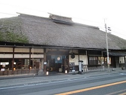国道にもどり戸倉の町に入ると明治天皇行在所址碑が建つ一角があった。たぶん本陣跡なのだろう。戸倉駅前にくると立派な萱葺き屋根の酒屋(坂井醸株式会社)があり、店頭に北国往還下戸倉宿 萱乃庵の木柱が立っていた。