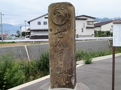 その先犀川に突き当たる手前に入口にあったのと同じ「丹波嶋宿の遺産マップ」と書かれた案内板が置かれている。案内板によると、突き当りが丹波嶋の渡し場跡になるが、道は旧枡形を右折する。この枡形の辺りに宿の枡茶屋があり、「旅人はその茶屋で休み、船が出る時急いで腰をあげ、国役土手をのぼって川原に降りて、渡し船で犀川を渡ったものであろう」と記されている。