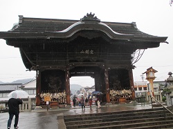 境内に入ると、まず見えてくるのが仁王門。仁王門前、左は大本願、右には宿坊が立ち並ぶ。境内入口から山門まで続く約400mの参道には、7777枚あるといわれる石畳が整然と敷かれている。