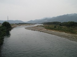 すこし先に「笄(こうがい)の渡し」跡がある。川向うには、均整が取れていて印象的な形の岩井堂山が見られる。