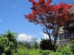 街道沿いには、黒姫、妙高を借景として、いろいろな花々に飾られた雪国独特の作りの洒落た家々が続く。