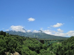 妙高大橋の中ほどからは、雄大な妙高が眼前に広がって絶景である。