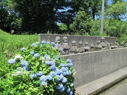 明治天皇小休所、西蓮寺など眺めながら先に進むと、アジサイの傍らに、多数の五輪塔が立ち並んでいる。これは、上杉謙信の跡目争い「御館の乱」で戦死した人を弔う無名戦士の墓だという。