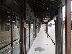 街道は南本町で左折するが、そこは古い商店街で、典型的な雁木通りが続いている。