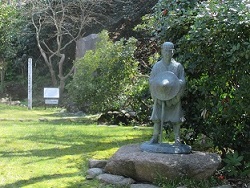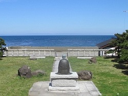 すぐのところに良寛(1758~1831)の生家橘屋跡があり、良寛堂が建っている。良寛は出雲崎の名主橘屋の長男としてここに生まれた。橘屋は江戸初期に栄えたが、良寛の時代には尼瀬が台頭して、橘屋が一手に引き受けていた金銀の荷受け業務も尼瀬の京屋に移っていった。こうした中、良寛は18歳で家を出て修行の道に入った。良寛堂のうしろに座す良寛像は、海の向こうに見える母の生地・佐渡を正面に臨んでいる。