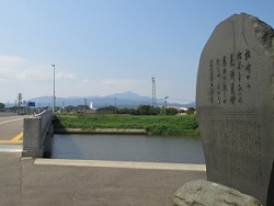 出雲崎の家並みが尽きる荒谷橋のあたりに「北国街道」の標柱が建っている。「小諸まで55里(220km)、江戸まで97里(388km)とあり、ここから北国街道、中山道を経て江戸まで送られた佐渡金銀の道のりを示している。