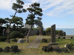 狭い路地奥に見える円明院前を通り旧道を少し行くと、左側に芭蕉園がある。敦賀屋跡が公園になっており、芭蕉像と「銀河ノ序」を刻んだ碑などが建てられている。元禄2年(1689)7月4日(陽暦8月18日)、芭蕉は奥の細道行脚の途中この地に立ち寄り、かの有名な「荒海や佐渡によこたふ天河」の句を残した。芭蕉は「奥の細道」では越後路での出来事をほとんど記していないが、「銀河ノ序」では出雲崎と「荒海や・・・」の句に込めた思いが記されている。
