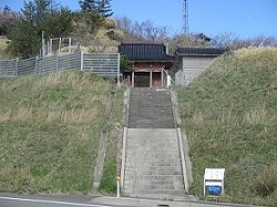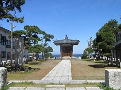 岬の小公園からの景観を眺めて国道に戻ると、道路の反対側に観音堂への道に繋がる仁王門が石段の上に建っている。