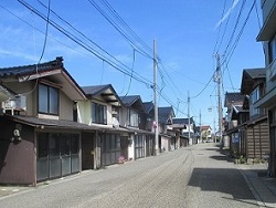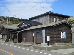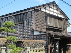 このあたりから尼瀬地区にかけて、妻入り街並みがよく残っている。妻入りというのは、切妻造りの建物の妻側に入り口を設けて正面とするもの。当時の出雲崎の人口は小高い丘と日本海に挟まれたわずかな平場に約2万人もいたと言われ、人口密度は越後一だった。そのため、多くの人が居住でき、また間口の広さに掛けられる税金対策にもなることから、間口が狭く奥行きの長い妻入り家屋が軒を連ね、妻入りの街並が形成された。