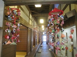 長い板塀を巡らせた廻船問屋泊屋跡を眺めながら進むと、無料休憩所となっている妻入り会館がある。ちょっと覗いてみると、伝統的な妻入り住宅の内部が再現されており、飾り雛がきれいに飾られていたりして、なかなか風情がある。