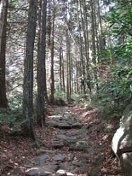 一里塚の先の石畳道を上って西海子(さいかち)坂を過ぎると一旦県道に出て、七曲がりの車道をしばらく行くと、橿木(かしのき)坂に行き着く。坂と言っても長くて急な石段で、箱根旧街道で一番きついところである。