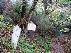 やがて国道が左に大きく曲がっているところで、旧道は国道にぶつかる。その右側に旧道入り口があり、接待茶屋の案内板が立っている。昔ここに無料で人や馬に食べ物を施す茶屋があったという。