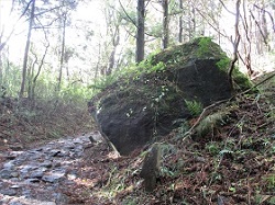 東電の畑宿発電所辺りで、須雲川を渡ると自然探勝歩道は一旦県道に出て、そこから少し先で箱根旧東海道・石畳道に入る。ここは曽我の仇討ちにまつわる伝承がある割石坂で、途中「これより江戸時代の石畳」という標識がある。