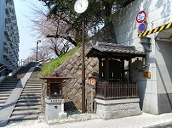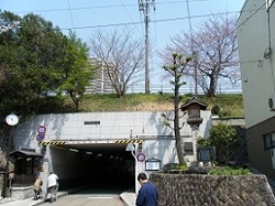 一里塚から道なりに進み、大江4丁目を過ぎて右に曲がりながらしばらく行くと、正善寺のところで直角に左折する。しばらくまっすぐ進んで浄光寺のところで右折し、ゆるい坂を上がって行くと大きな道路にぶつかる。この道路を左に曲がるとすぐに高橋川にかかる赤い欄干の橋を渡る。
