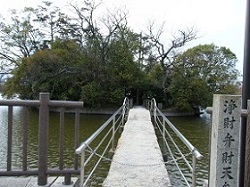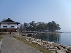 交差点を膳所神社と反対方向に行くと、琵琶湖畔に出る。そこは膳所城が建っていた場所で現在は膳所城跡公園になっている。膳所城は天守閣や石垣、白壁の塀などが琵琶湖に浮かぶ大変美しい城だったという。