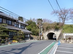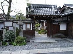三条通を渡ったこのあたりに日ノ岡に向かう旧道があるはずで、いかにもそれらしき冠木門があるので入ってみると、どうも様子が違っている。しばし、旧道への入口がわからず、うろうろと迷った末に、それらしき道を入って見ると、民家の門前に車石が置いてあり、やっとのことで旧道に入れた。