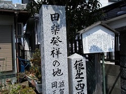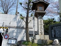そこを過ぎると金勝川の土手にぶつかるので、右に行く。右側に見える地蔵院を過ぎて、緩く左へ曲っていく先は、目川という立場だった。菜飯田楽発祥の地として有名だったところで、元伊勢屋、古志ま屋、京いせやという3軒の茶屋の碑が建てられている。