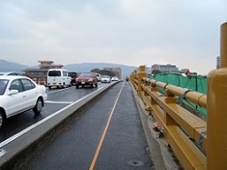 草津市の標識を過ぎて、土手の上の方に歩いて行く。草津川は天井川だったので、江戸時代の東海道は渇水期には川に降りて渡っていったそうだが、現在は、国道の先に架かる草津川橋を渡る。