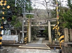 JRの陸橋を越えると関蝉丸神社(下社)が見えてくる。ここは、鳥居のすぐ手前の京阪線の踏切を渡って入って行く。