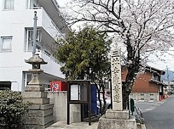 石山駅横を通り、晴嵐交差点を過ぎると、まもなく膳所城下の入口になっていた南惣門跡碑が住宅の脇にちょこんと立っている。これから先は膳所城の城下町であり、枡形の道となっている。