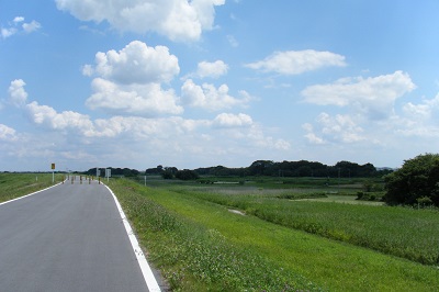 地蔵堂の横から久下に至る約2.7kmの堤の上を歩く。青空のもと遥か彼方まで見渡す限り広がる河川敷を歩くのは実に気持ちがいい。但し、日陰が無いところを延々と歩くので、熱中症を気にしながらひたすら歩くことに・・・。